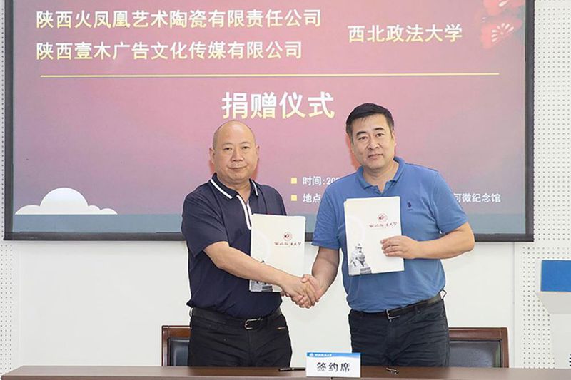 5月30日,国花瓷西凤酒、火凤凰艺术陶瓷与西北政法大学捐赠仪式在西北政法大学长安校区何微纪念馆举行,双方共同发起成立艺术专业发展基金,探索共赢路径,实现校企融合发展。