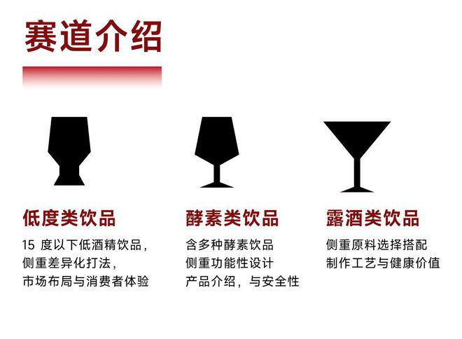 酒说了解到,为深入发掘优质潮流饮品品牌方案,本次比赛设立3大赛道,分别为低度类饮品(15度以下低酒精饮品)、酵素类产品和露酒类产品。三大赛道锚定差异化打法、市场布局与消费者体验、功能性与健康价值等核心内容,面向全球范围内的品牌、营销、创意、策划等方向的人群开放报名。