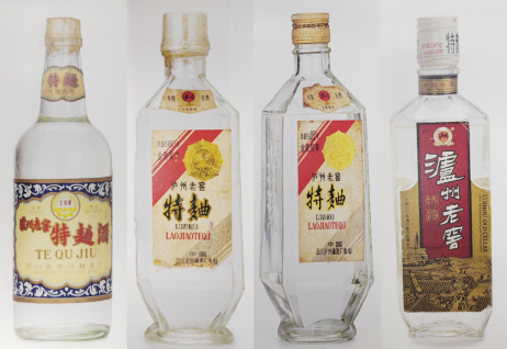 B组(1979年工农牌特曲、1981年方瓶特曲、1987年方瓶特曲、1989年异形瓶特曲,共四瓶)