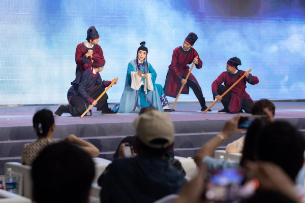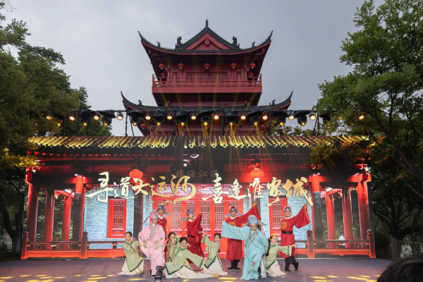 里运河畔,华灯初上,游人如织。在演员们的蹁跹舞姿、空灵歌声和婉转唱腔中,融合人生四喜情境的淮安特色民俗节目《淮安四喜》、呈现文学经典的淮剧《吴承恩》等精彩演出轮番登场,拉开了一场美酒与运河的对话。