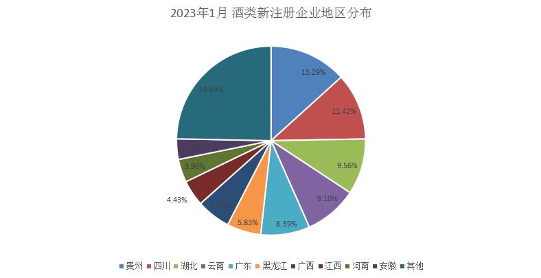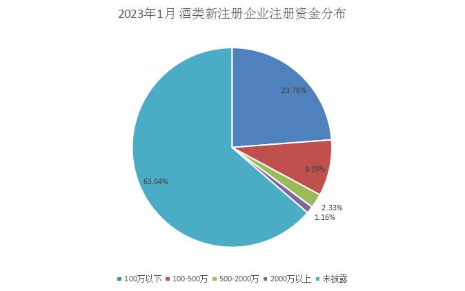 2023年1月,新增酒类注册企业中仍以中小型企业居多。其中注册资金在100万人民币以下的企业占比为23.78%,注册资金在100-500万人民币的企业占比为9.09%,注册资金在500-2000万人民币的企业占比为2.33%,注册资金超过2000万人民币的企业仅占1.16%。