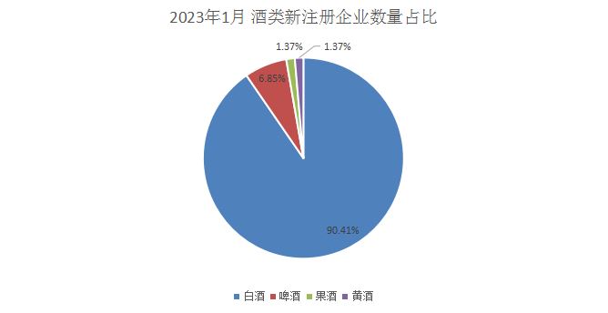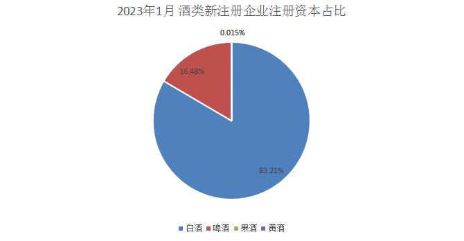 在1月429起酒类新增注册企业中,白酒、啤酒、果酒、黄酒(天眼查数据库中未查到葡萄酒企业)的占比分别为90.41%、6.85%、1.37%、1.37%;而在7.65亿注册资本总金额中(仅计算公布的),白酒、啤酒、果酒、黄酒的占比分别为83.21%、16.48%、0.015%、0.015%,无论从注册企业规模还是从注册资本规模来看,白酒仍牢牢占据主导地位。