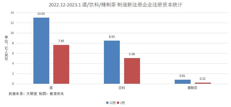 根据天眼查数据库,2023年1月,包括白酒、饮料与精制茶制在内的等酒水企业新增注册659家,新增注册资本12.93亿(不含未披露企业)。而2022年12月,中国酒水企业新增注册1420家,新增注册资本22.37亿,注册企业规模与资本资本规模均有较大幅度减少。