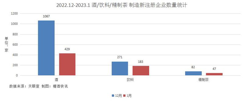 在导出数据统计的过程中发现,1月酒水行业中酒类新增注册企业减少最为明显,1月新增注册企业规模较12月(2022年)环比减少了59.79%,而饮料类新增注册企业环比减少了32.47%,精制茶加工类企业也环比减少了42.68%。