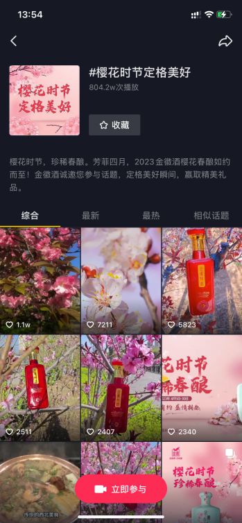 金徽酒抖音平台发起的线上挑战赛“樱花时节定格美好”,吸引了众多粉丝、员工朋友纷纷打卡参与,抖音话题播放量超800万。同时金徽酒还邀请了各地网络达人、摄影及古装爱好者等入厂拍摄并记录金徽樱花的精彩时刻。此外,徽县文化旅游节系列活动启动及招商项目签约也在金徽酒文化广场如期举行。