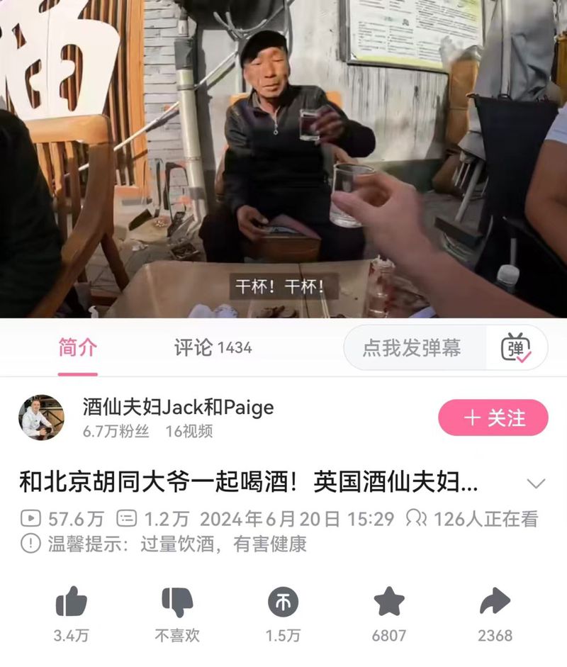 在这个视频中,酒仙夫妇走进北京胡同感受老北京人的日常生活,后又与在家门口晒太阳的北京大爷畅饮了一下午白酒(郎酒),因而被网友们称为“酒仙夫妇”。此视频也创下了Jack和Paige夫妇视频播放记录,达到了14万播放量,是“China travel”系列中表现最好的视频(至今仍被主页置顶),较此前5万左右的视频播放量翻了近3倍播放。