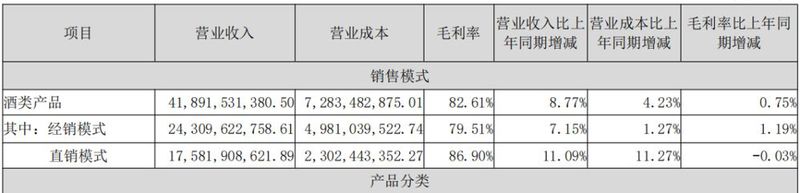 据五粮液半年报披露,在455.06亿元的营收中,酒类产品营收为418.92亿元,同比增长8.77%;整体毛利率为82.61%,同比增长0.75%。
