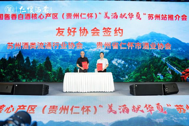 在嘉宾们见证下,仁怀市酒业协会副秘书长张小波与苏州酒类流通行业协会副秘书长汤国星进行友好签约,为两地酒业合作架起一座坚实的桥梁,开启辉煌的新篇章。