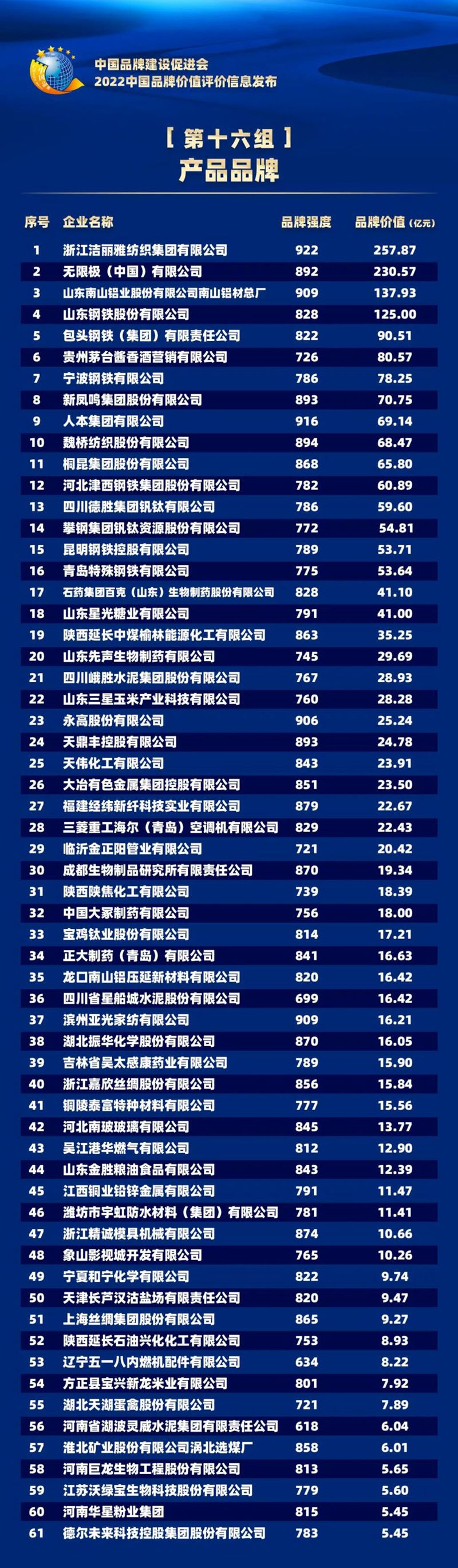 另有片仔癀、稻香村、雅戈尔、洋河、山东能源、晋能控股、广药集团、安踏、泸州老窖、潍柴动力、老板电器、中铁高新等118个企业品牌、产品品牌和五常大米、武夷岩茶、贺兰山东麓葡萄酒等33个区域品牌价值超过百亿元。