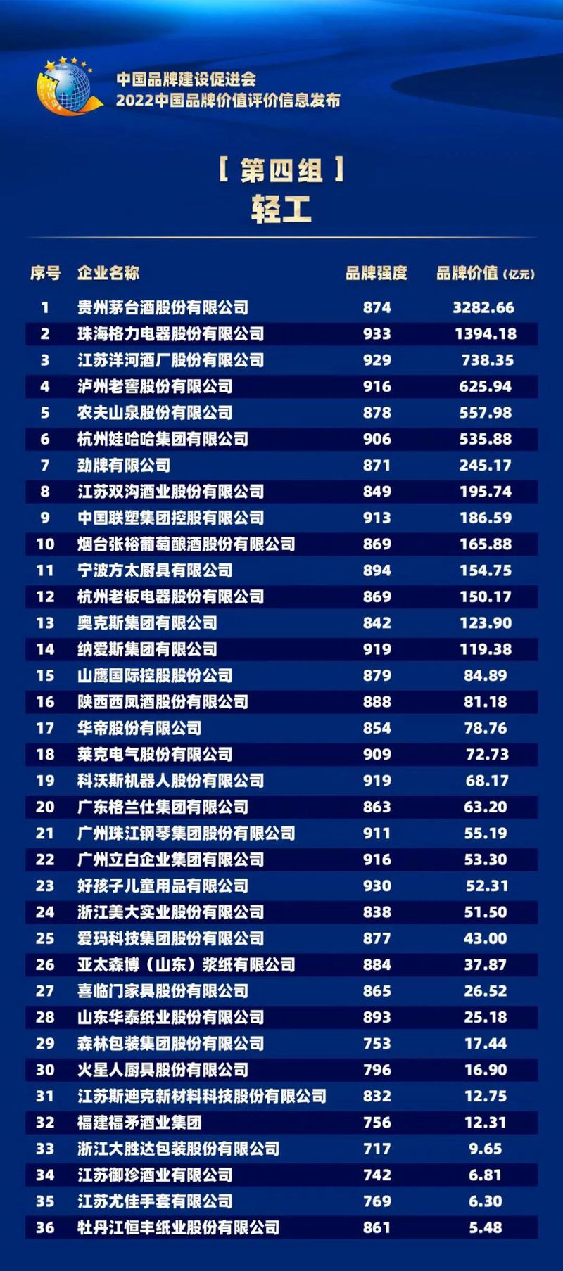 本次品牌价值评价信息发布,对部分优秀品牌实行主动评价,其中贵州茅台酒以3282.66亿元品牌价值,名列轻工领域第一。同时,茅台酱香酒以80.57亿元的品牌价值,位列产品品牌组第六位。