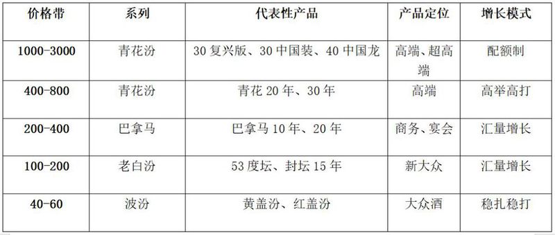 1)次高端400-800元价格带:汾酒的主力产品为青花20、青花30,市占率为5%。