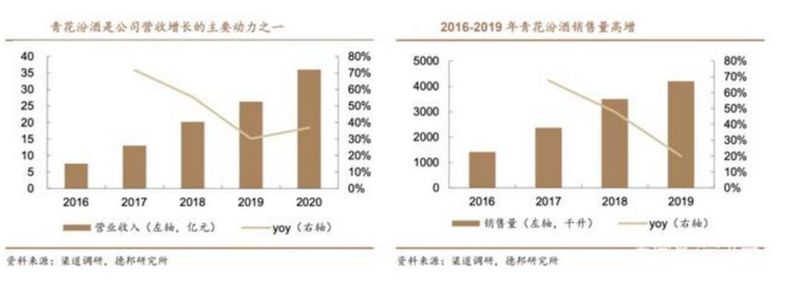 汾酒的次高端青花系列,近年的营收增速在30%以上,远超行业平均水平。