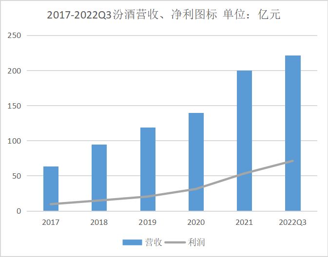 作为山西国企改革的试点单位,汾酒近年来业绩连续高速增长,2022年,在“汾酒复兴123总纲领”的战略引领下,汾酒经营业绩再创造历史新高,上市公司前三季度营业收入221.44亿元,同比增长了28.32%,净利润实现71.08亿元,同比增长了45.7%,仅仅用了9个月的时间,就超过了2021年的全年业绩。