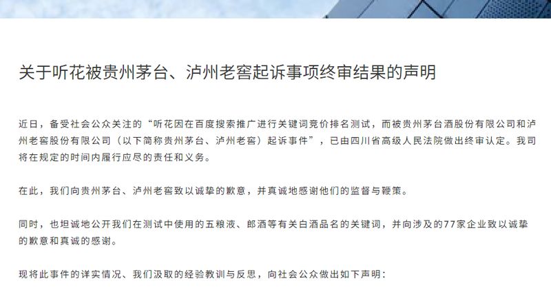贵州茅台与泸州老窖在2021年9月中旬到10月初在网页上以自身为关键词搜索时出现听花酒信息,认为被告涉嫌侵犯其商标权和不正当竞争,对此分别索赔50万和30万。据四川高院终审判决,听花上述行为不构成商标侵权,但构成不正当竞争,分别赔付30万和20万。听花酒表示服从判决,并致歉原告。