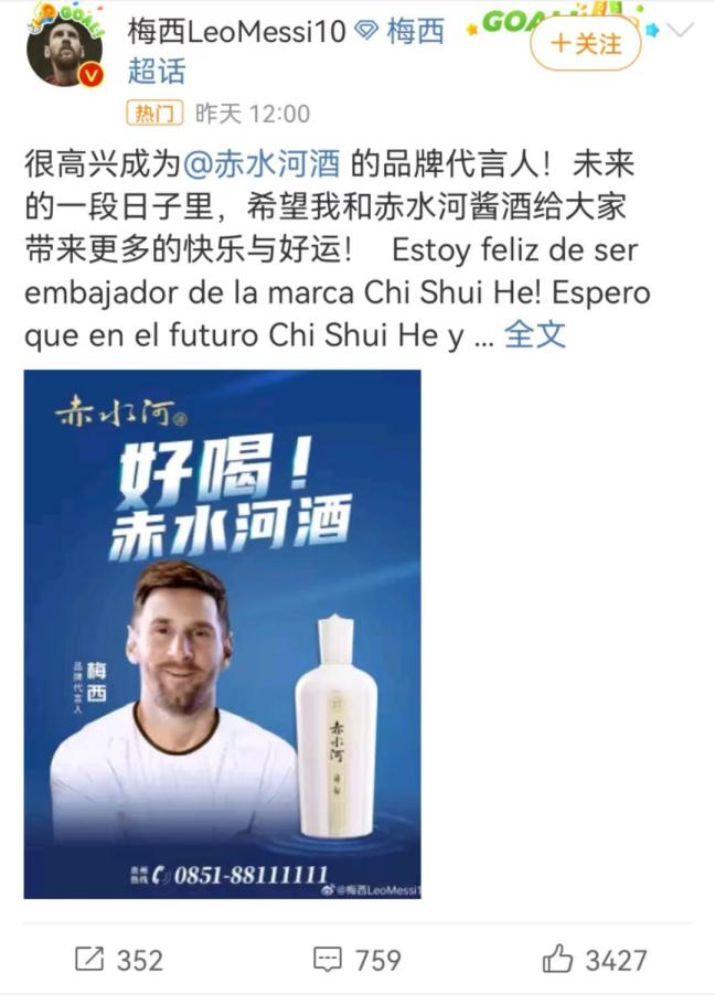8月1日,阿根廷足球运动员梅西在个人微博宣布,成为“赤水河酒”的品牌代言人。不久之后,赤水河酒官方微博也官宣发文,确定梅西在中国酒业的“第一代言”。