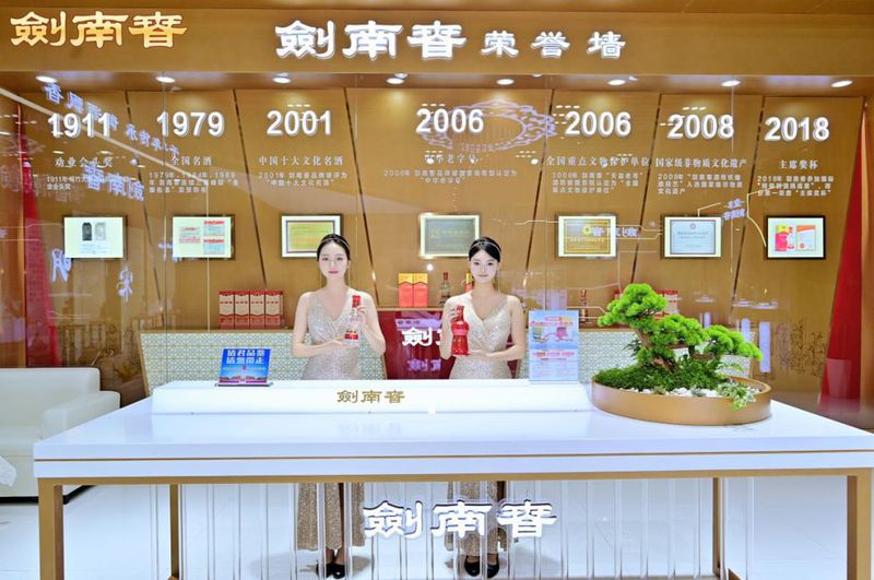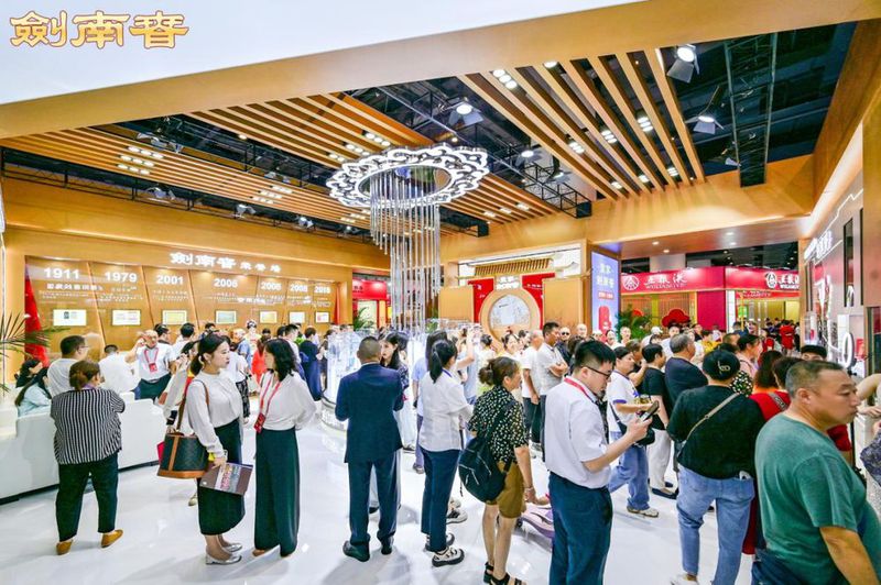在剑南春主题展馆内,集结了皇家剑南春、东方红1949、珍藏级剑南春、剑南春·老酒、水晶剑南春等核心产品,以及剑南春·青铜纪、剑南春·曼城三冠王纪念酒等特色文创产品,吸引了众多观众打卡拍照。