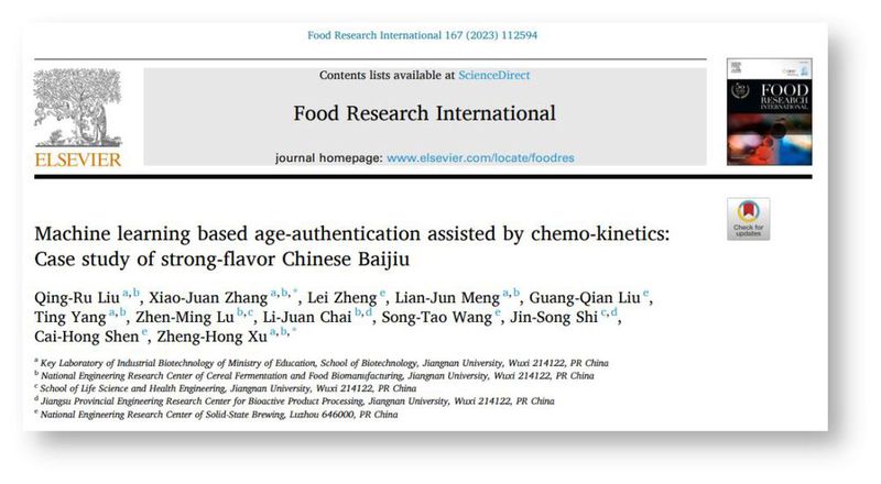 引用格式:Liu, Q.-R., Zhang, X.-J., Zheng, L., Meng, L.-J., Liu, G.-Q., Yang, T., Lu, Z.-M., Chai, L.-J., Wang, S.-T., Shi, J.-S., Shen, C.-H., Xu, Z.-H. (2023). Machine learning based age-authentication assisted by chemo-kinetics: Case study of strong-flavor Chinese Baijiu.[J] Food Research International, 112594.
