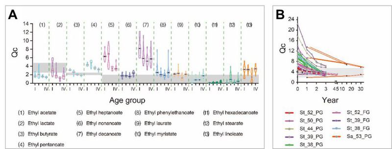 图2:陈酿过程中,系列反应浓度商(Qc)计算值以及根据文献报道的53个陈酿白酒样品数据计算得到Qc值