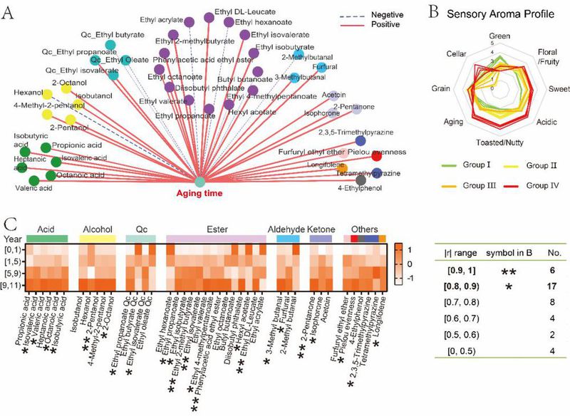 1、随着陈酿时间的增加,白酒中酸和长链乙酯的含量增加,它们通常能够使得白酒的香气和口感更柔和醇厚,此外,具有烘焙香、坚果香等愉悦香气的吡嗪和呈现松木香气的长叶烯在陈酿过程中也增加,这能够为陈酿白酒提供陈香等良好风味。结合感官审评发现,随陈酿时间的增加,酒体中的窖香、陈香、坚果香、酸香显著增加,而青香特征降低。