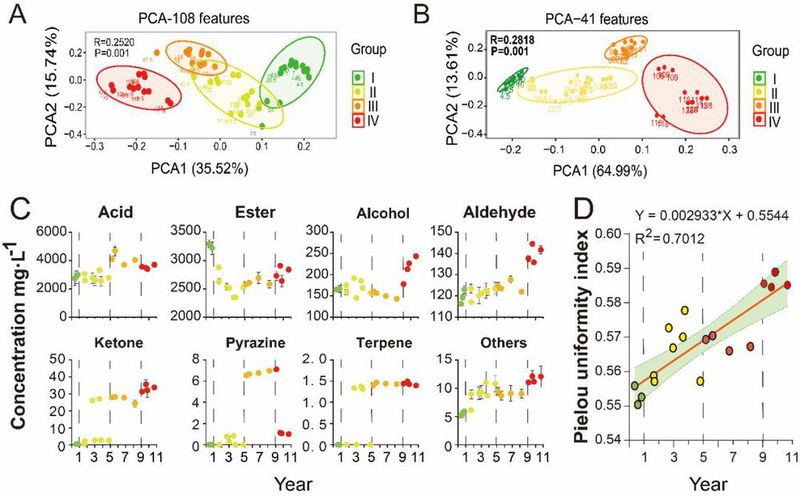2、白酒年份越老含有的化合物种类越多,随陈酿时间的增加,己酸乙酯等量大的化合物含量略有降低,丙酸乙酯、吡嗪、萜烯等量小的化合物含量逐渐增加,酒体中各类化合物的含量差距略有缩小,进行化学计量学分析后发现,风味物质结构的均匀度指数随着陈酿时间的延长而增加,均匀度指数越高,说明白酒的化合物组成越均匀,这在一定程度上为陈酿白酒的风味更协调提供了解释。