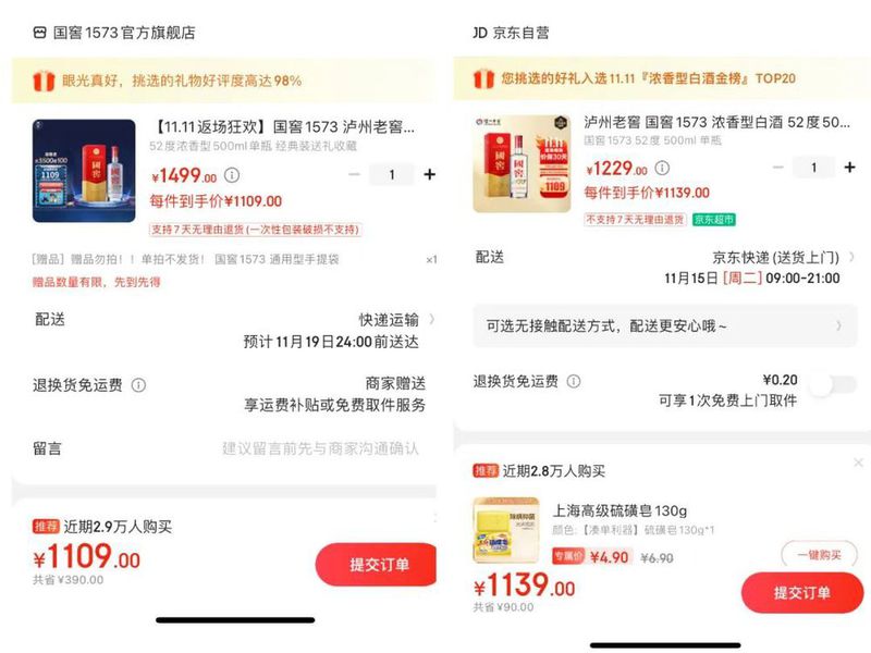 消费者方面。有心的消费者,如果试着将两个购买渠道都点开尝试购买会发现,实际上,国窖1573在京东官方旗舰店卖的价格,要比京东自营店的价格还要便宜30元。