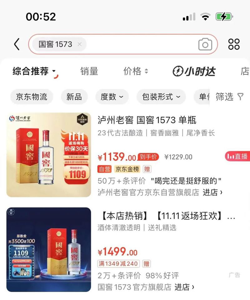 岳界刚登陆京东APP(时间为11月14日00:52)搜索“国窖1573”后发现, 京东并不存在低价销售(实际售卖价格比厂家高)的行为,而是存在不公平竞争,误导消费者,欺客行为。