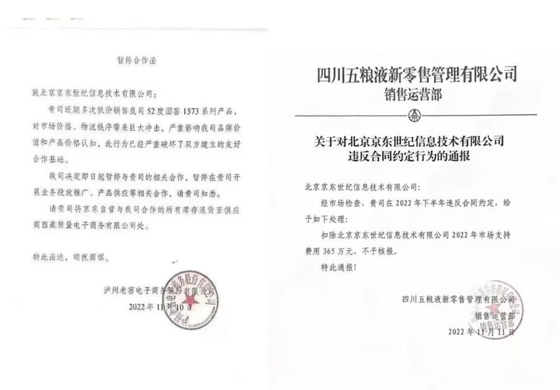 泸州老窖的函件中提到的“多次”低价销售,说明泸州老窖就此已主动与京东有过沟通交涉,双方沟通无果,泸州老窖便以“暂停合作”的口吻以示警告。