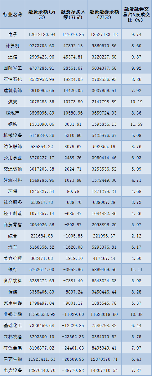 表:3月14日申万一级行业两融交易情况: