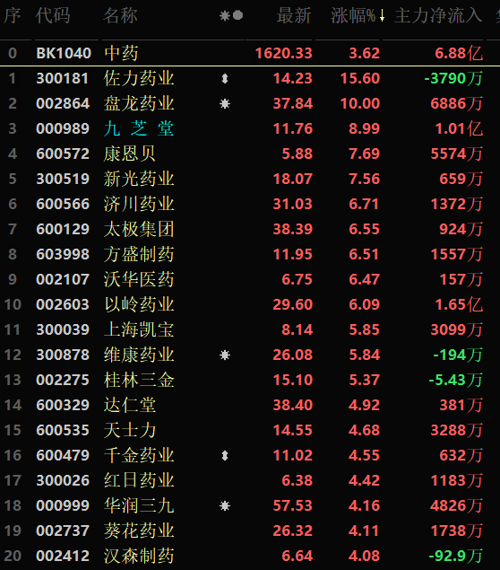 从早盘表现强势的中药行业看,该行业交易中的73只成份股中有71只上涨,其中,有13只个股涨幅超5%。资金方面,有6.88亿元大单资金净流入该行业,居各行业板块第2位。