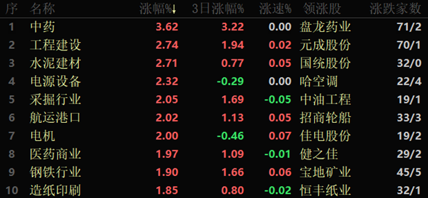 东方财富行业方面,截至3月15日11:30,86个行业板块中77类上涨,占比89.53%,其中,中药行业涨幅居首,达3.62%,另有包括工程建设和水泥建材等6个行业涨幅均超2%。下跌方面,计算机设备跌幅居首,达1.09%。