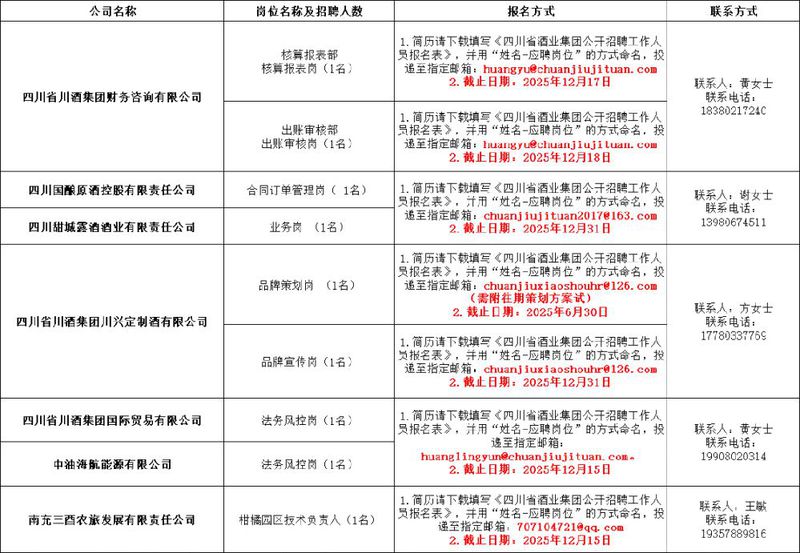 详见文末附件1:《四川省酒业集团有限责任公司下属子公司招聘岗位一览表(5月)》。