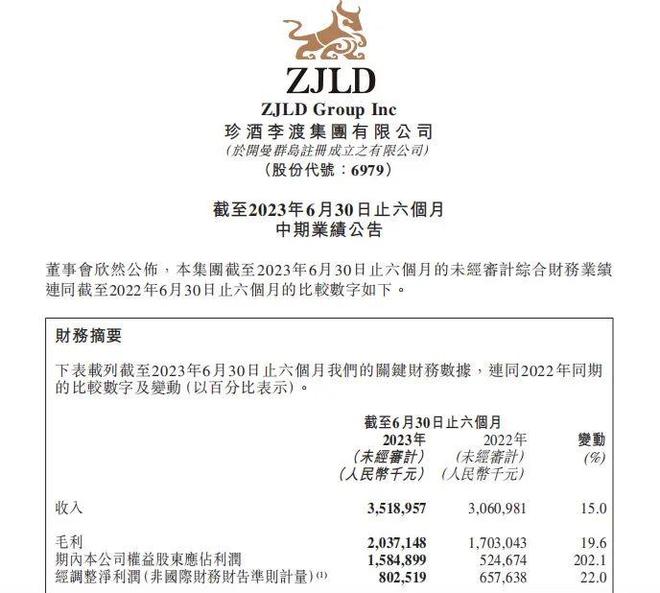 第一,稳定的财务状况。珍酒李渡财务状况稳定,包括良好的盈利能力和现金流,这是港股通机制所看重的条件之一。日前,珍酒李渡发布了上市后的首份成绩单,财报显示,2023年1-6月,珍酒李渡实现营业收入35.2亿元,同比增长15%,经调整净利润为8.03亿元,同比增长22%,营收、净利润均取得两位数增长,业绩远超市场预期,迎来 了“开门红”。