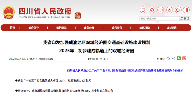 日前,四川省人民政府发布《四川省加强成渝地区双城经济圈交通基础设施建设规划》。根据规划,到2025年四川将形成53条进出川综合运输大通道,其中川渝之间27条。国际、国内航线覆盖城市分别达120个、180个,成渝地区双城经济圈综合立体交通网络建设取得重大突破。