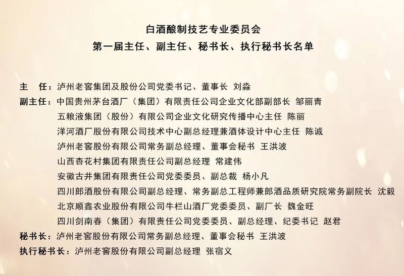 在系列会议中,通过了《中国非物质文化遗产保护协会白酒酿制技艺专业委员会管理办法》《中国非物质文化遗产保护协会白酒酿制技艺专业委员会选举办法》,并选举产生了中国非物质文化遗产保护协会白酒酿制技艺专业委员会第一届理事会成员及主任、副主任、秘书长、执行秘书长等组织机构负责人。
