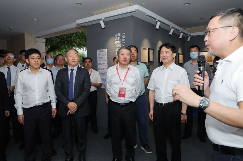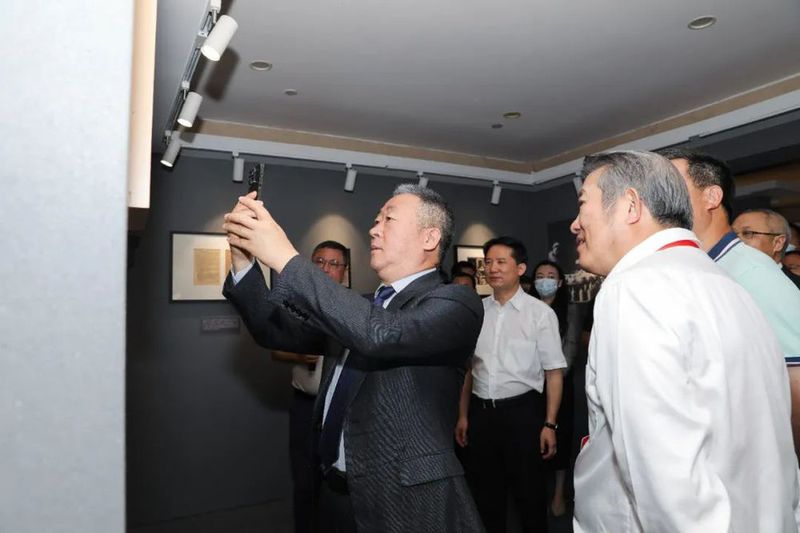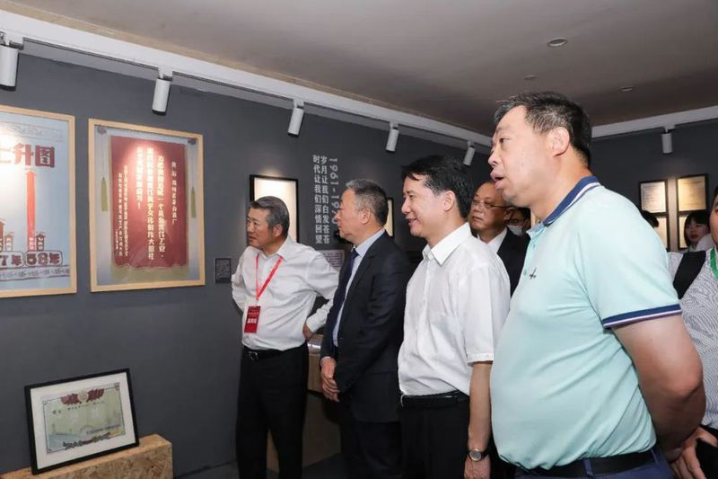 泰康保险集团创始人、董事长兼首席执行官陈东升(中),中国酒业协会理事长宋书玉(左二),茅台集团党委书记、董事长丁雄军(右二),集团党委副书记、总经理李静仁(左一)参观“贵州茅台辉煌七十年回顾展”。