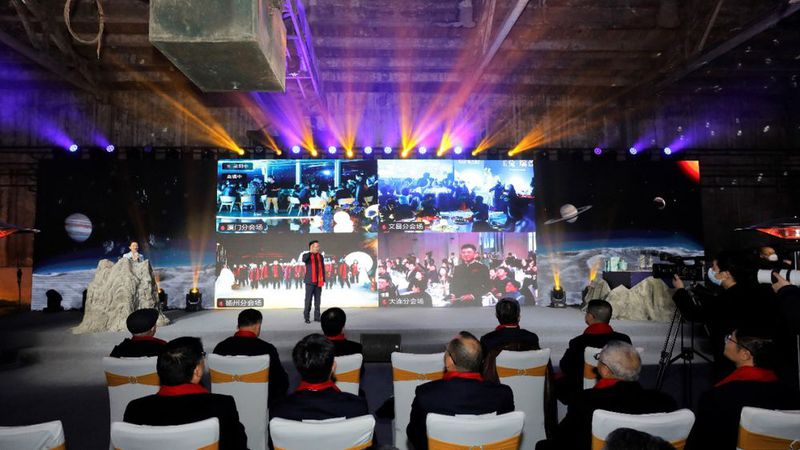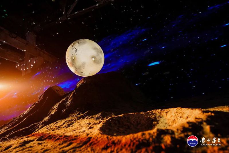 进入发布会现场,204平米的环形山与流动投影形成奇妙的组合效应,通过富有现代审美和科技表达的深度创作,“茅酒之源”1号车间成为独特的“月球发布会”现场。